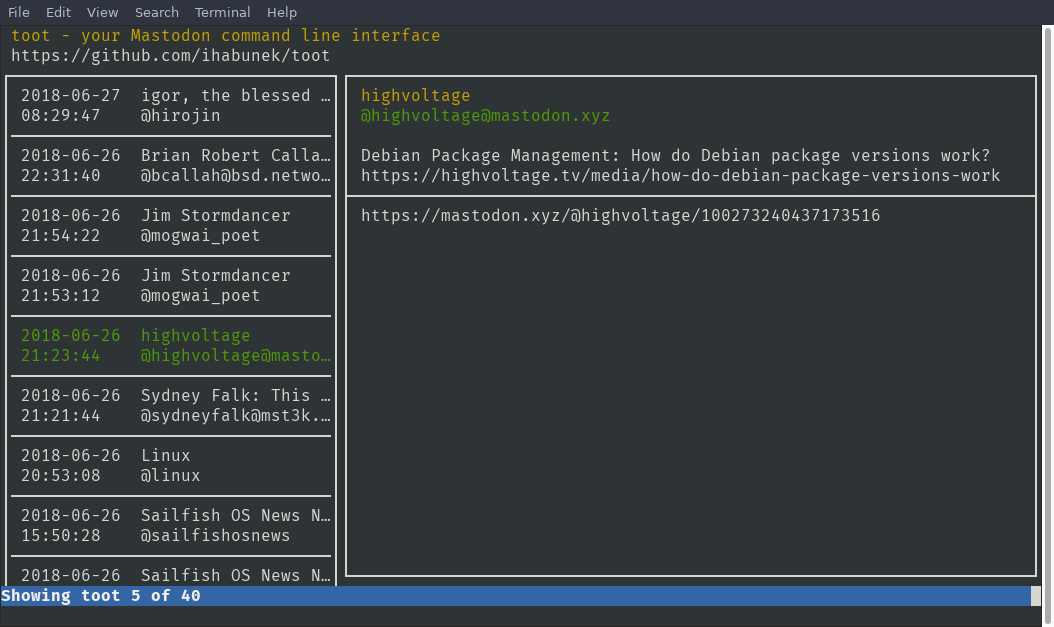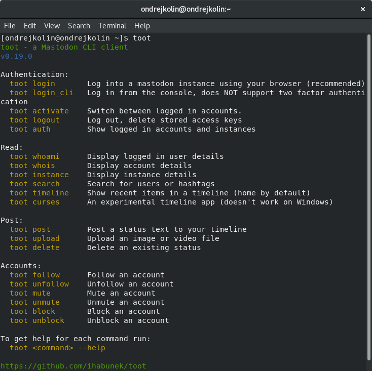 Pro milovníky příkazové řádky tu máme ještě Toot, který obsahuje experimentální textové rozhraní. Aplikace je napsaná v Pythonu a jde ji snadno nainstalovat přes pip. Při testování se mi bohužel nepovedlo klienta spustit. Nedělal jsem nějakou zevrubnou analýzu problému a uvádím ho především pro zajímavost. Pokud Vás klient zaujal, můžete ho otestovat a s případnou recenzí se s námi podělit, projekt najdete na Githubu. Jsou i další klienti, zkuste si schválně vyhledat spojení "Mastodon CLI", nebo něco takového.