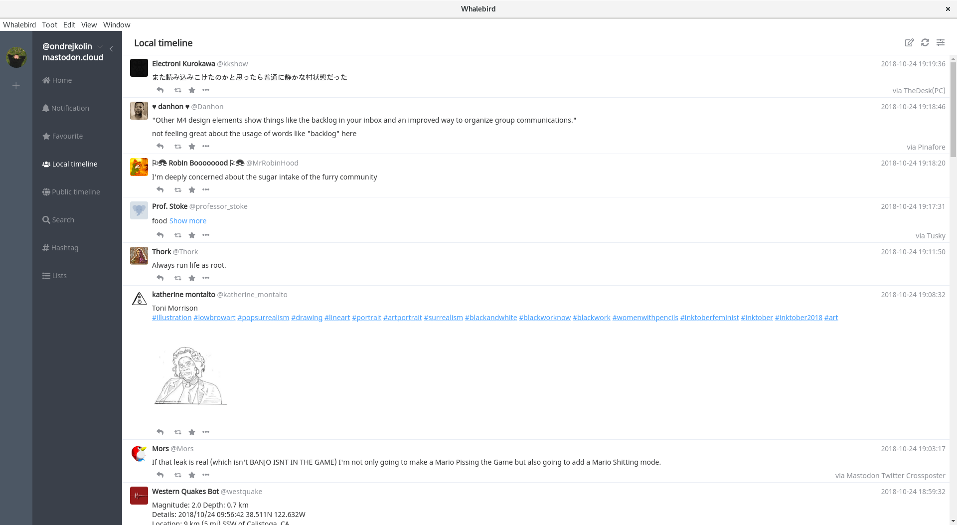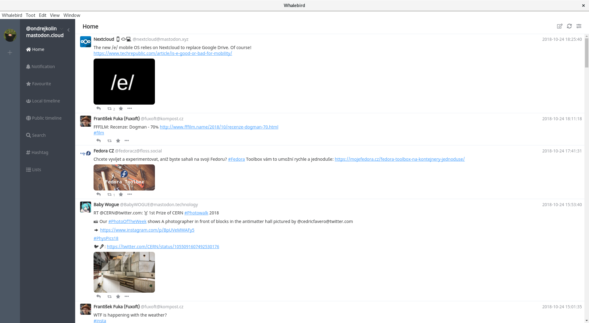 Další na řadu přichází Whalebird s velmi svěžím a dobře zvládnutým rozhraním. Celá aplikace je postavená na frameworku Electron (jako třeba Atom a další populární aplikace). Pro uživatele je na webu ke stažení rpm, deb balíček, či případně tar.bz archiv. Domovská stránka projektu je whalebird.org a na vývoj se můžete podívat na githubu. Rozhraní je velmi zdařilé, přehledné a umožňuje například snadnou správu vašich více účtů podobně jako to má například komunikační platforma Slack.