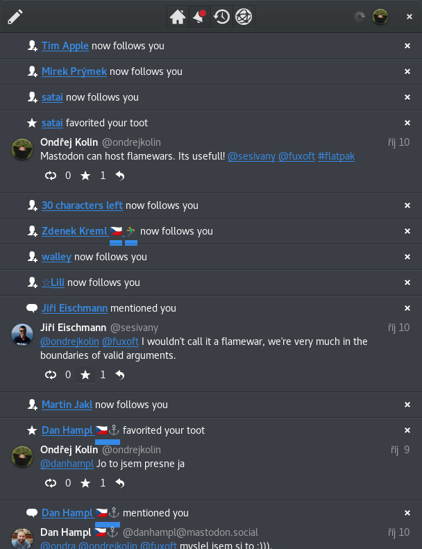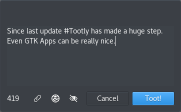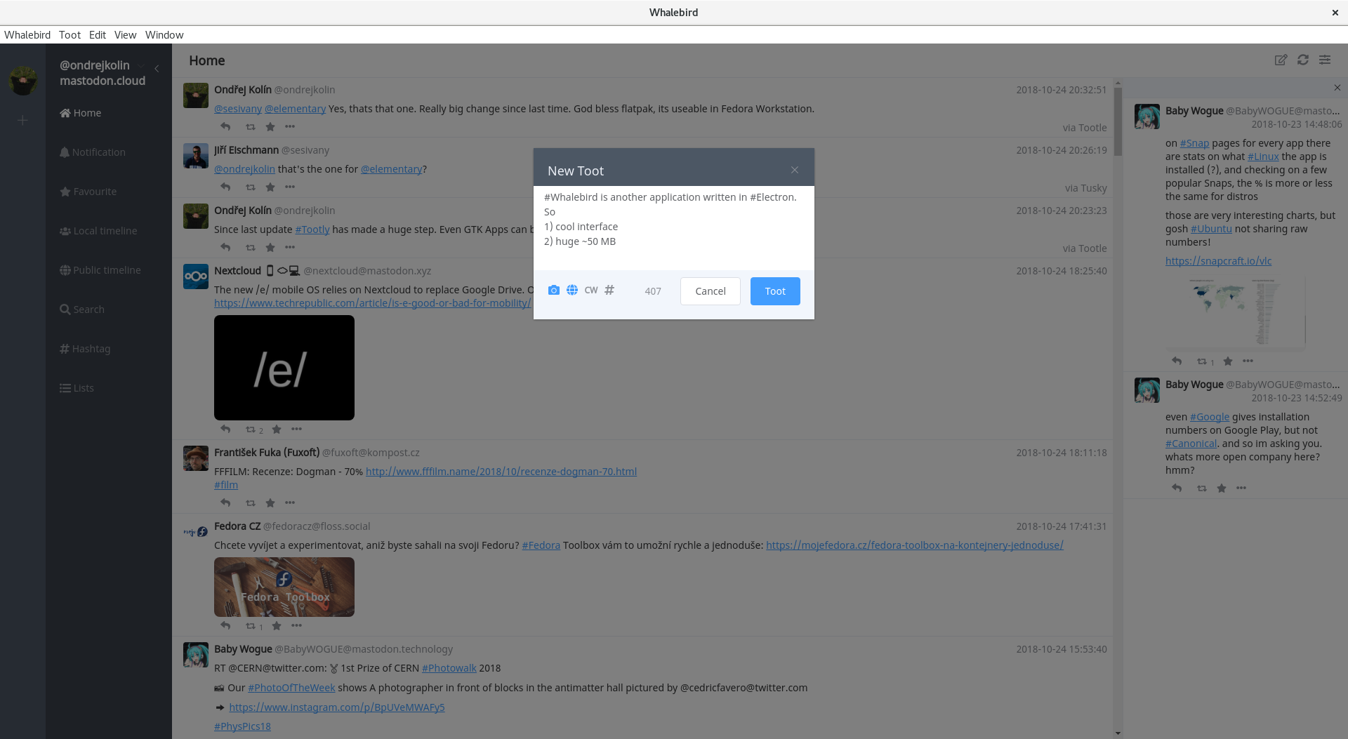 Mastodon zkouším primárně z důvodu zániku Google+, protože ačkoliv se mu přezdívalo "město duchů", bylo zde pár lidí, které se vyplatilo sledovat. Doufejme, že se podaří na sociální síti Mastodon také nějakou komunitu vybudovat. Třeba začněte sledovat @fedoracz@floss.social. Ačkoliv jsem původně chtěl spíše doporučovat Whalebird, tak po nedávné aktualizaci bych spíše doporučil Tootle. Instalace z flatpaku je snadná, vypadá dobře a zapadne do prostředí Gnome, Whalebird oproti tomu má zase velikou výhodu v možnostech správy více účtů najednou.